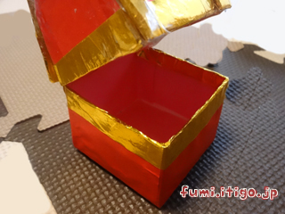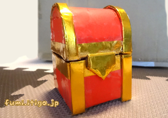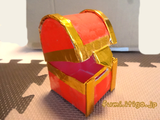 本当はダンボールで実物(?)の大きさの宝箱を作ろうかと思ったのですが、折り紙の消費量を考えて今回はコンパクトな牛乳パックで作りました。